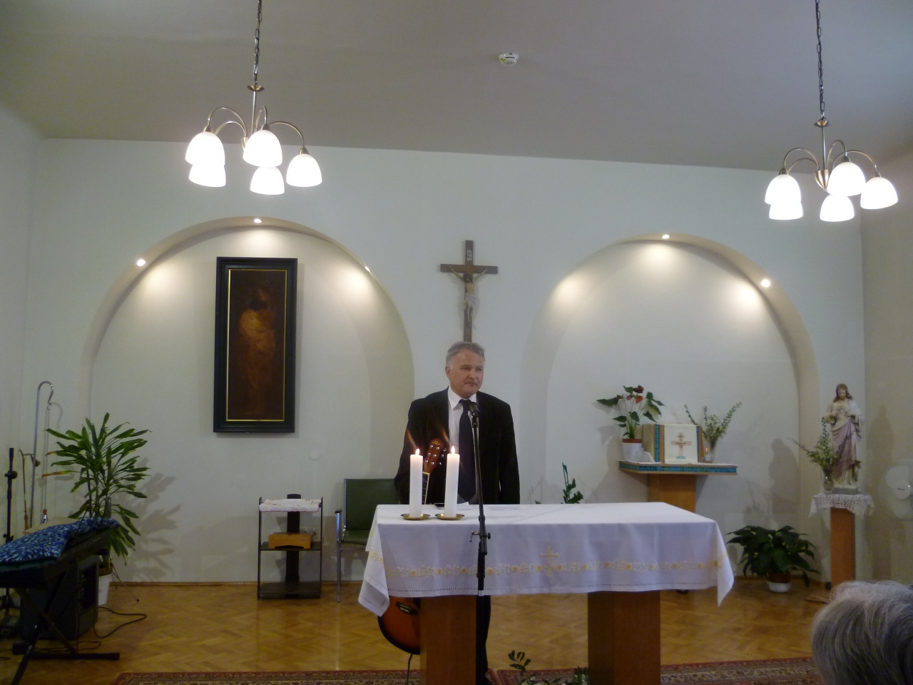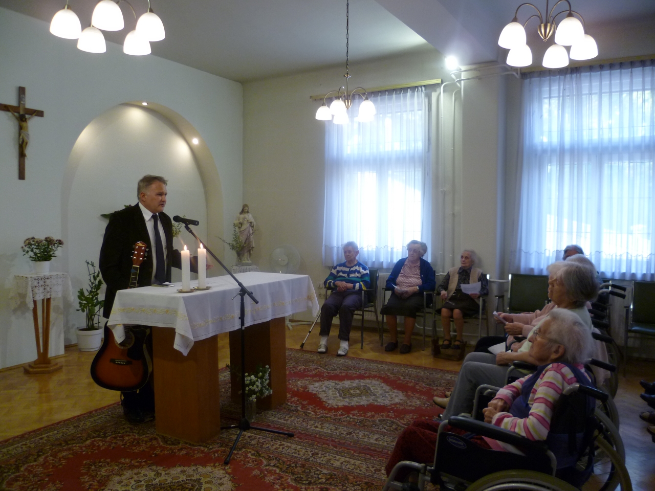 Baranka György evangélikus lelkész úr tartott imaórát a mai délutánon. Erre az alkalomra is hozta a gitárját, közösen megtanultuk és elénekeltük Pecznyik Pál egyik népszerű megzenésített költeményét. Beszédében a gyógyító Jézusról és a mindennapi kis és nagy csodákról hallottunk. Lakóinkra nagy hatást gyakorolt a Lelkész Úr személyisége és előadásmódja. Nagy örömünkre szolgál, hogy kapcsolatunk rendszeressé válik, hiszen a Lelkész Úr novemberben is ellátogat Otthonunkba.