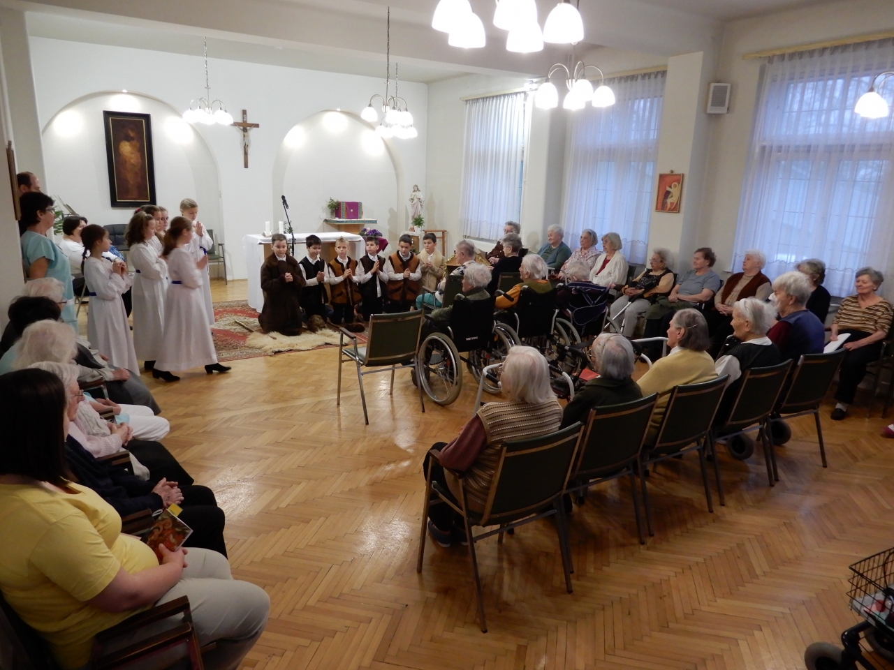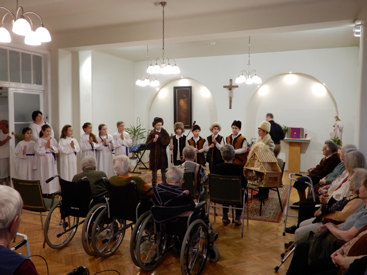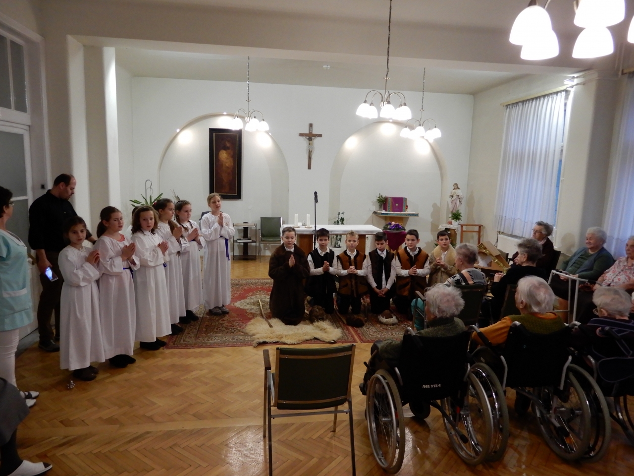 A Szent Erzsébet Katolikus Általános Iskola 4. osztályos tanulói az Otthon kápolnájában betlehemes játékot adtak elő. Az őszinte, tiszta gyermekarcok, a szépen csengő gyermekhangok, a gondos jelmezek igazi ünnepi áhítatot hoztak lakóink szívébe. Köszönet a felkészítő pedagógusoknak és a szülőknek, nagyon szépen szerepeltek a gyerekek. Furulyával kísért hagyományos karácsonyi dalok hangoztak el, a betlehem is ügyes kezeket dicsér. Az előadás végén lakóink ünneplőbe öltözött szívvel énekeltek együtt a gyerekekkel.