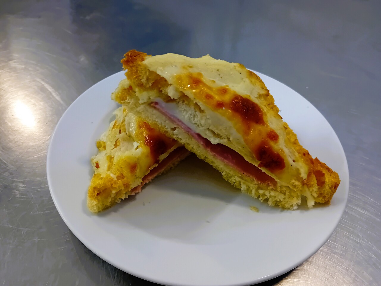 Elkészült a híres Croque monsieur (ejtsd: krok möszjő): sajtos-sonkás töltött melegszendvics, amit besamelmártással csináltunk volt, aki duplázott annyira különleges volt számára.