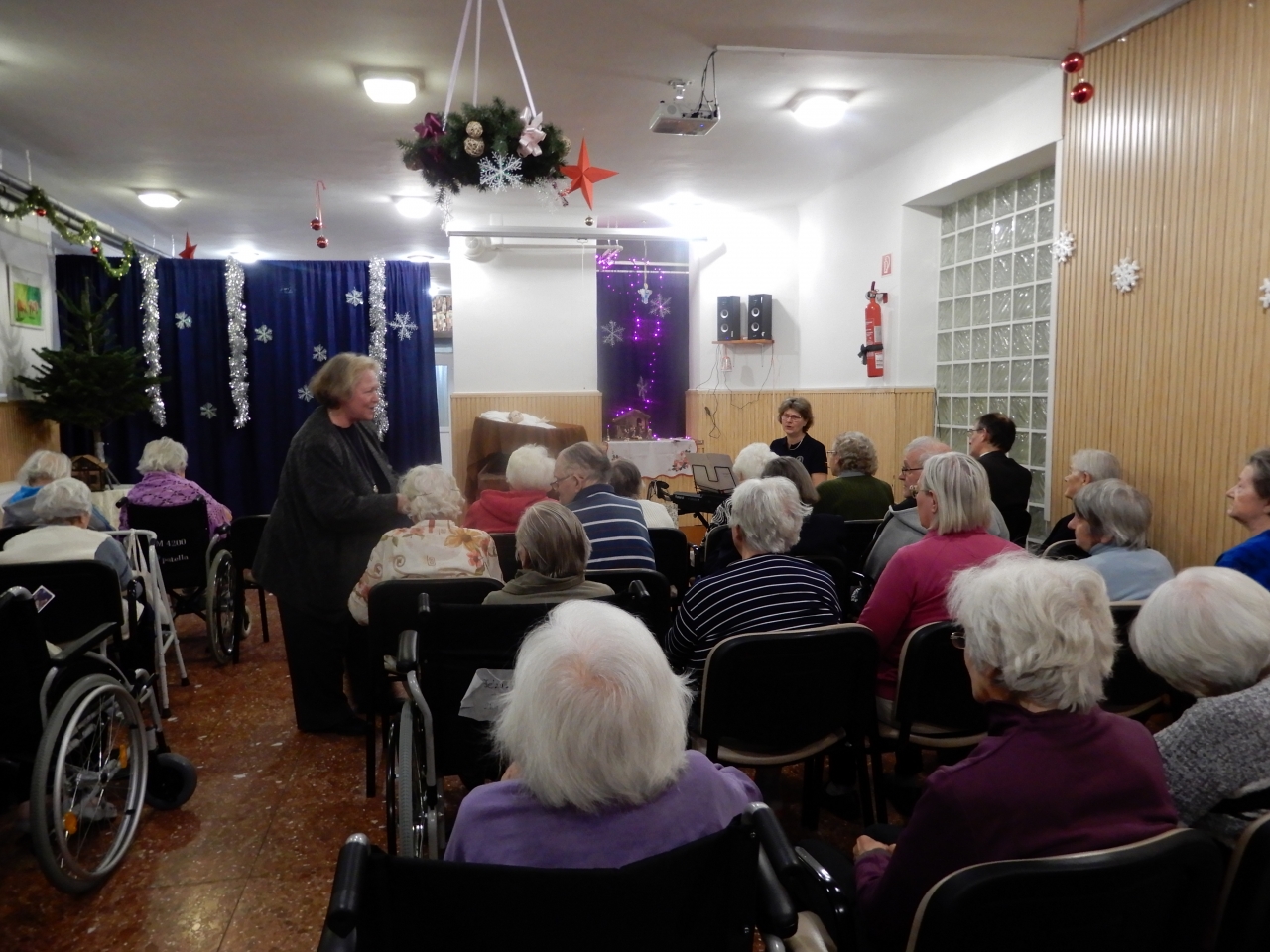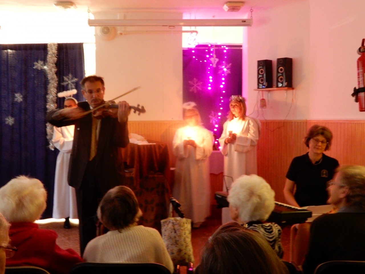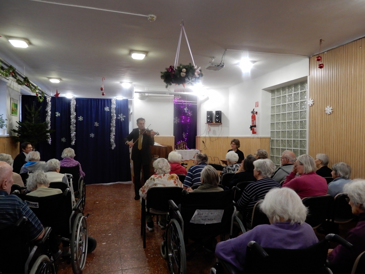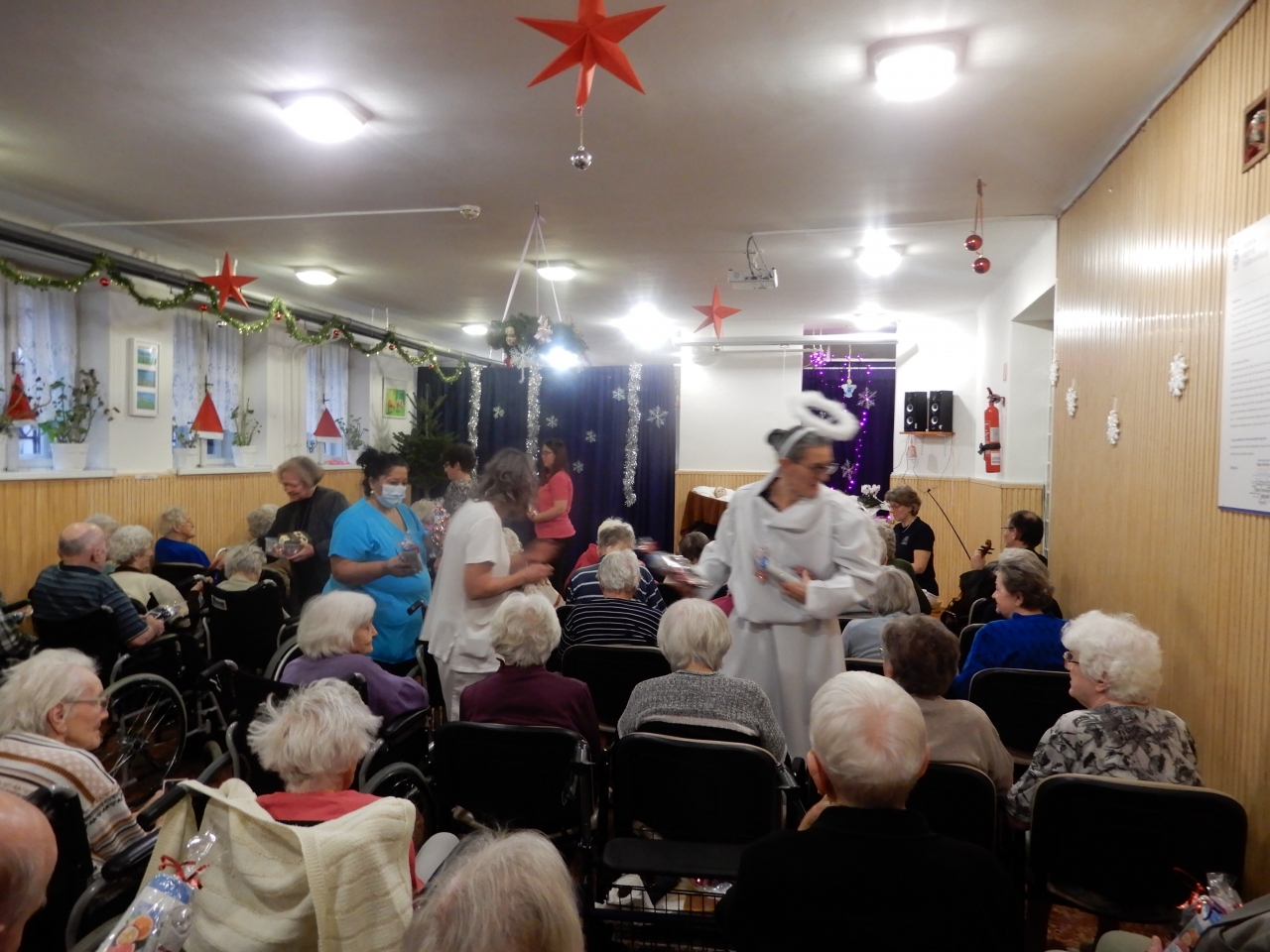 Ezután munkatársaink kiosztották lakóinknak az ajándékot, ez alatt még orgona és hegedű kisérettel közismert karácsonyi dalokat énekeltek. A műsor után hálás szívvel, a Karácsony titkától megérintve folytatták a délutánt.