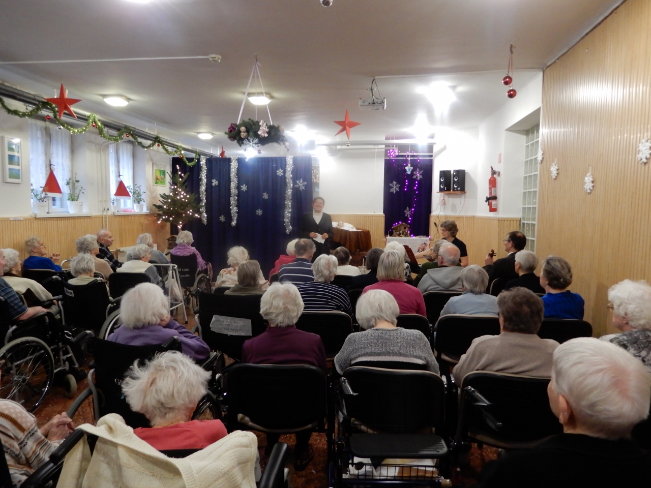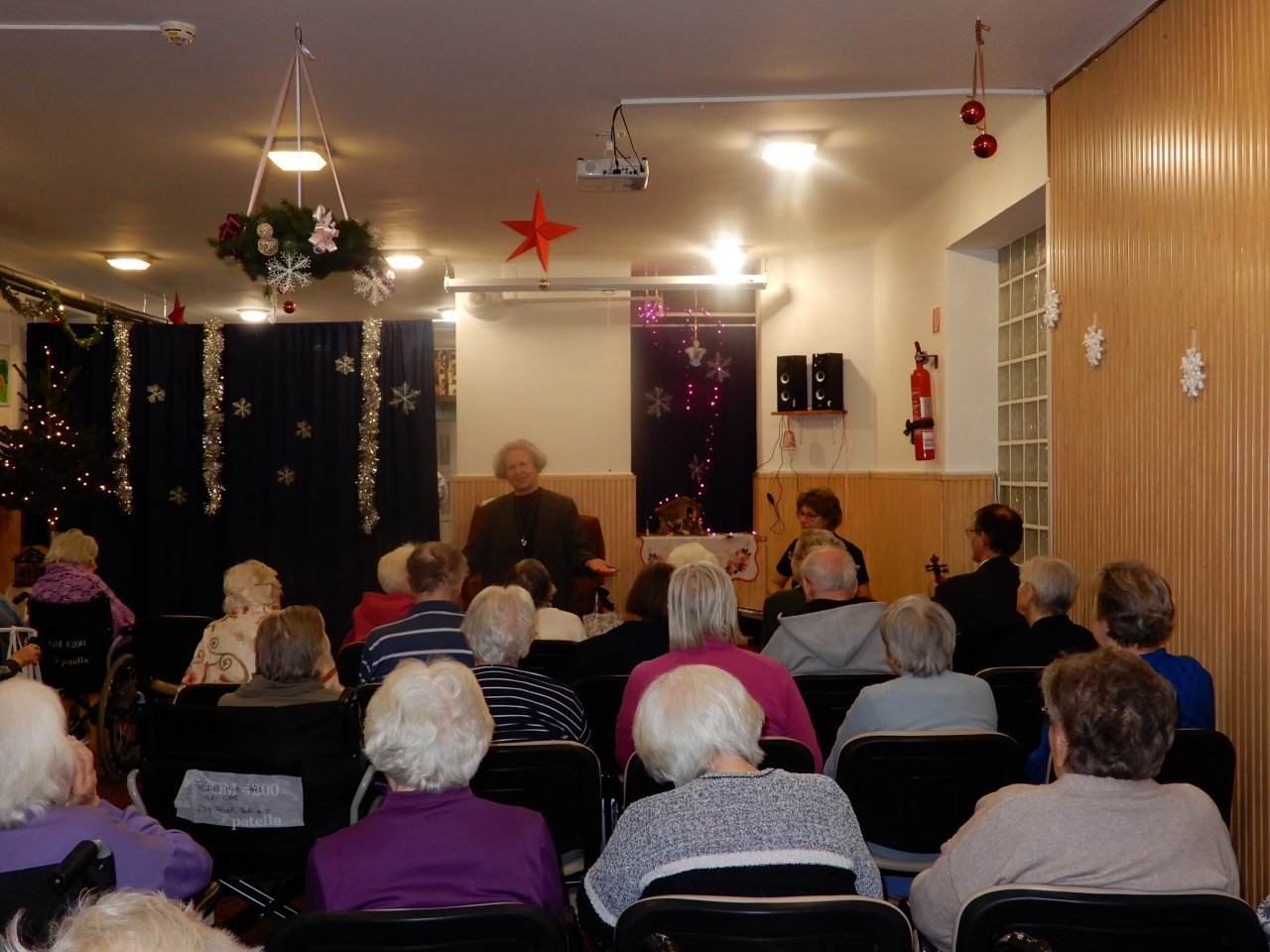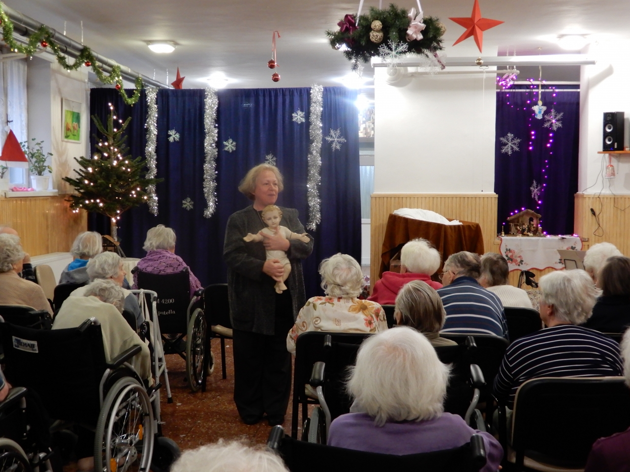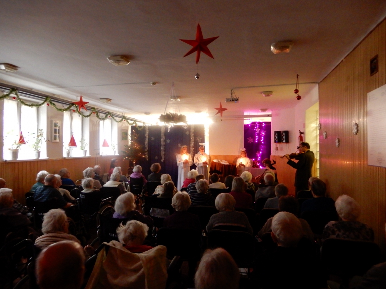 Ezután munkatársaink kiosztották lakóinknak az ajándékot, ez alatt még orgona és hegedű kisérettel közismert karácsonyi dalokat énekeltek. A műsor után hálás szívvel, a Karácsony titkától megérintve folytatták a délutánt.