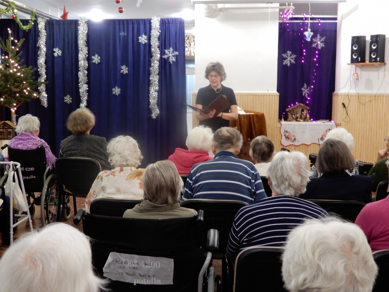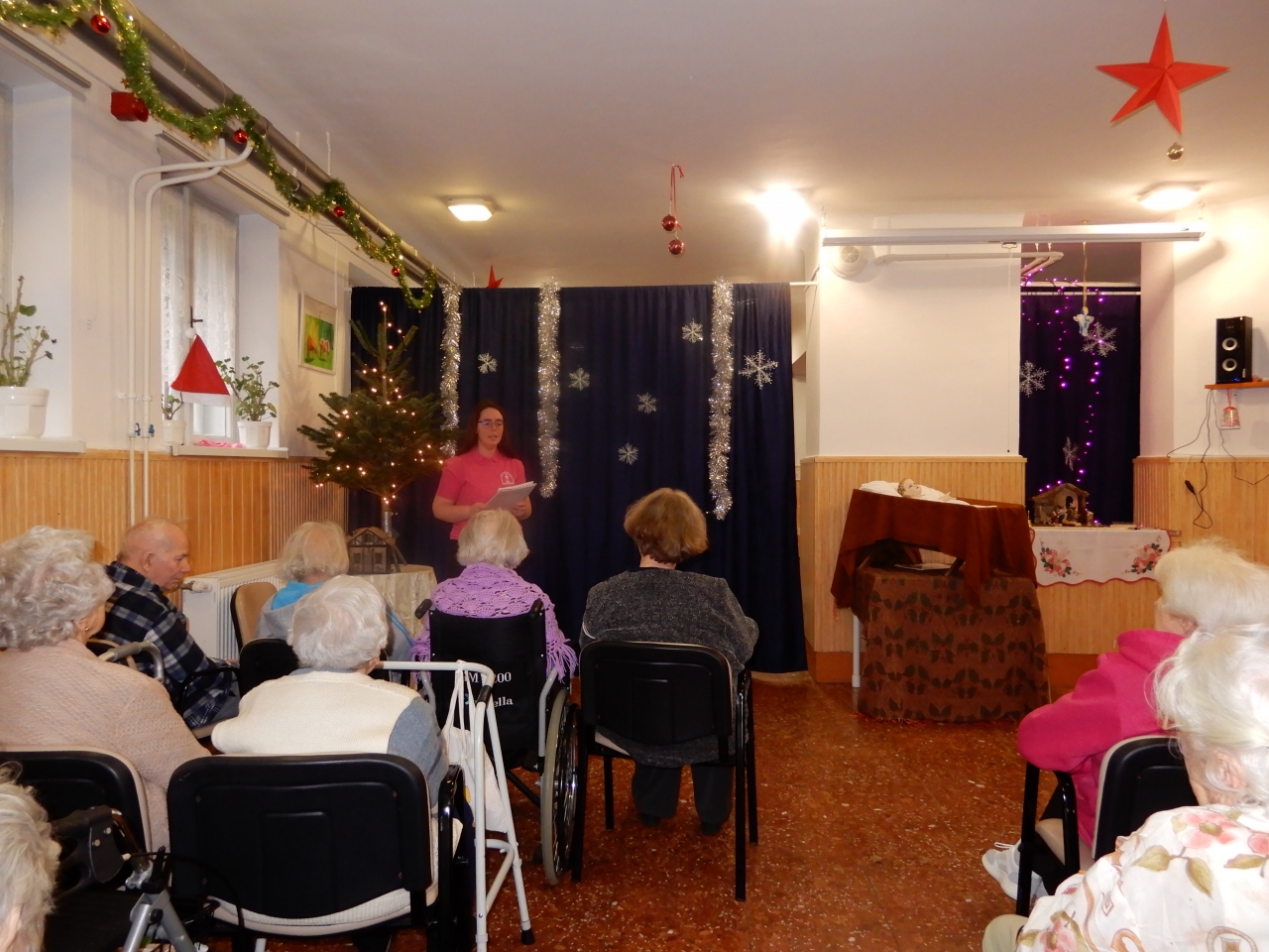 A Mentálhigiénés csoport tagjai erre az alkalomra színházteremmé varázsolták az ebédlőt. Lakóink és a jelen lévő hozzátartozók zsúfolásig megtöltötték gyönyörű „színháztermünket”.