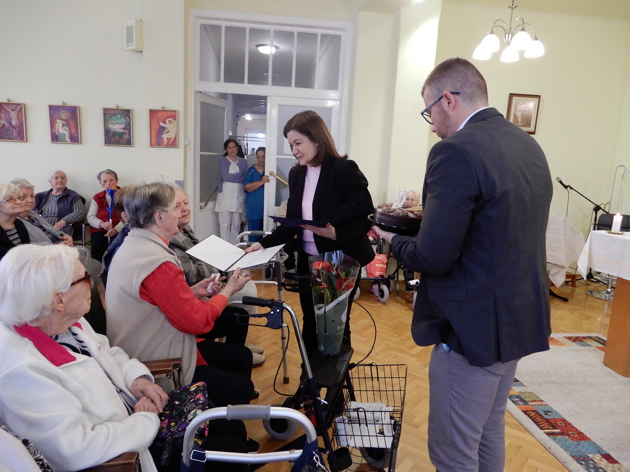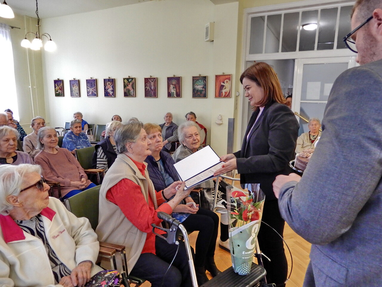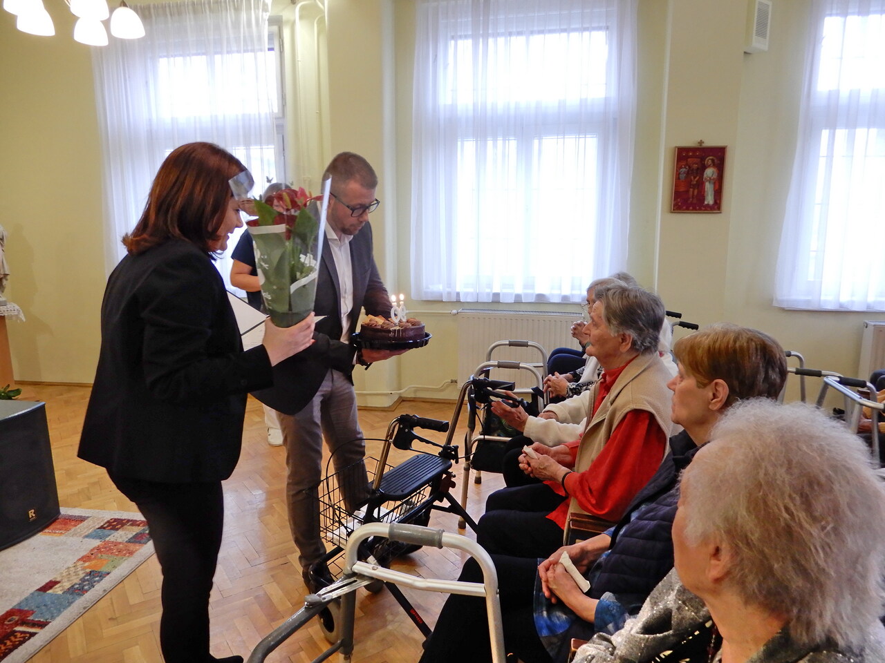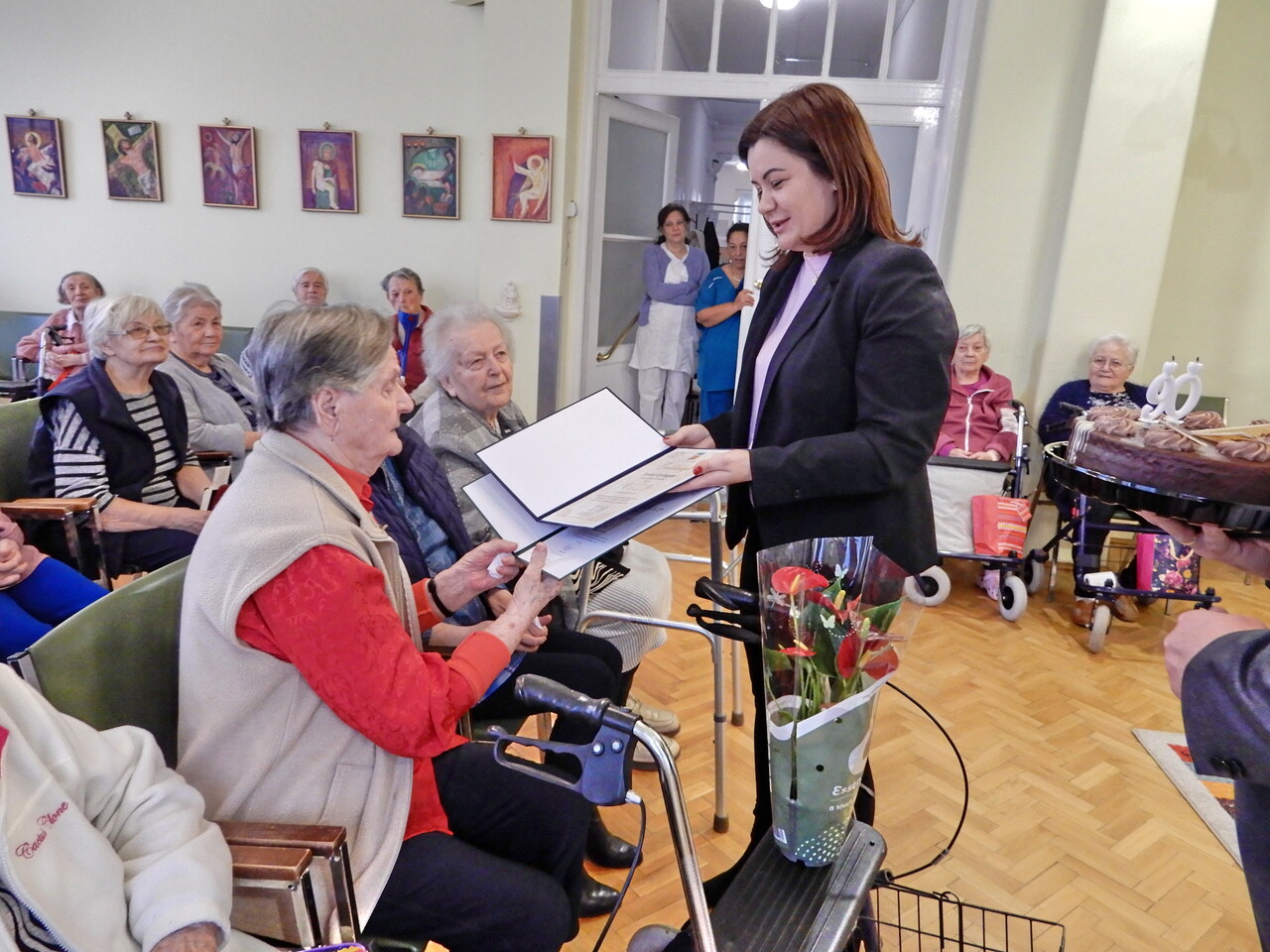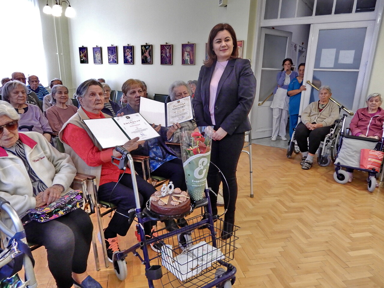 Tordai Györgyné Erzsike nénit 90. születésnapja alkalmából köszöntöttük. Pécel Város Önkormányzata részéről a Polgármester Asszony Dr. Kővári Alexandra emléklapot csokoládétortát és egy nagyon szép virágot ajándékozott ez alkalomból az ünnepeltnek. Intézményünk dolgozói verssel, és lakótársaival együtt egy közös énekléssel járultak hozzá a köszöntéshez.